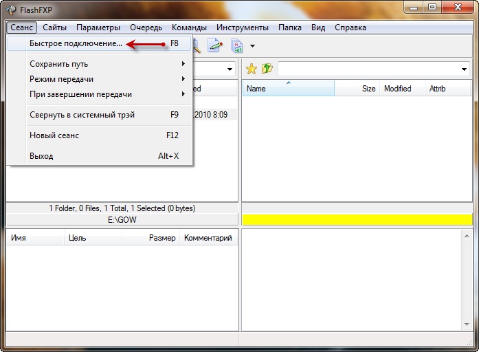 Нажимаем в меню "Сеанс -> Быстрое подключение"