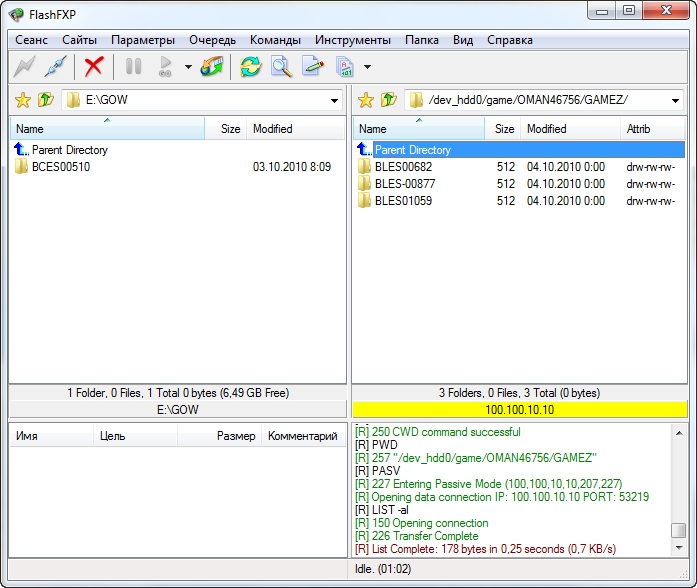 Переходим в левом окне к папке с игрой на вашем компьютере, которую вы хотите перекинуть на PS3. А в правом окне переходим в папку на PS3, куда мы будем закидывать игру. Месторасположение игры на плойке зависит от установленного Менеджера Бэкапов, который устанавливает путь к папке с играми: