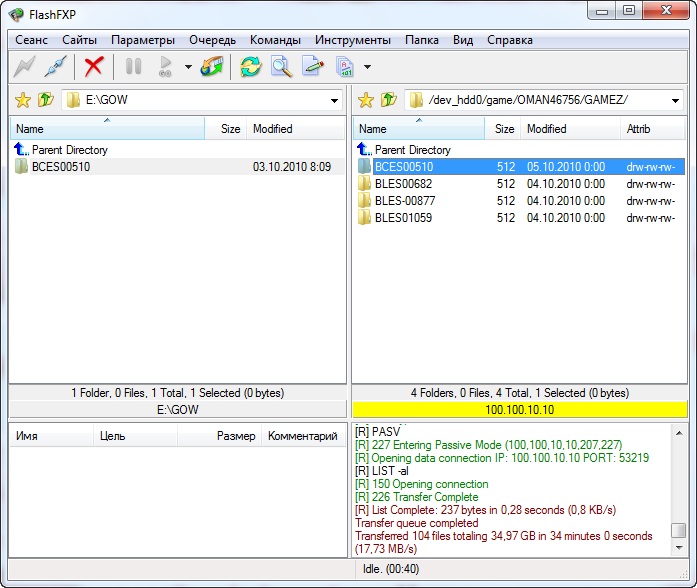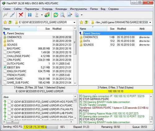 Скорость передачи у меня держалась на 17,73 МB/s и игра God of War, размером 34,97 GB передалась ровно за 34 минуты! Эти данные вы можете увидеть по окончании передачи в правом нижнем окне логов: